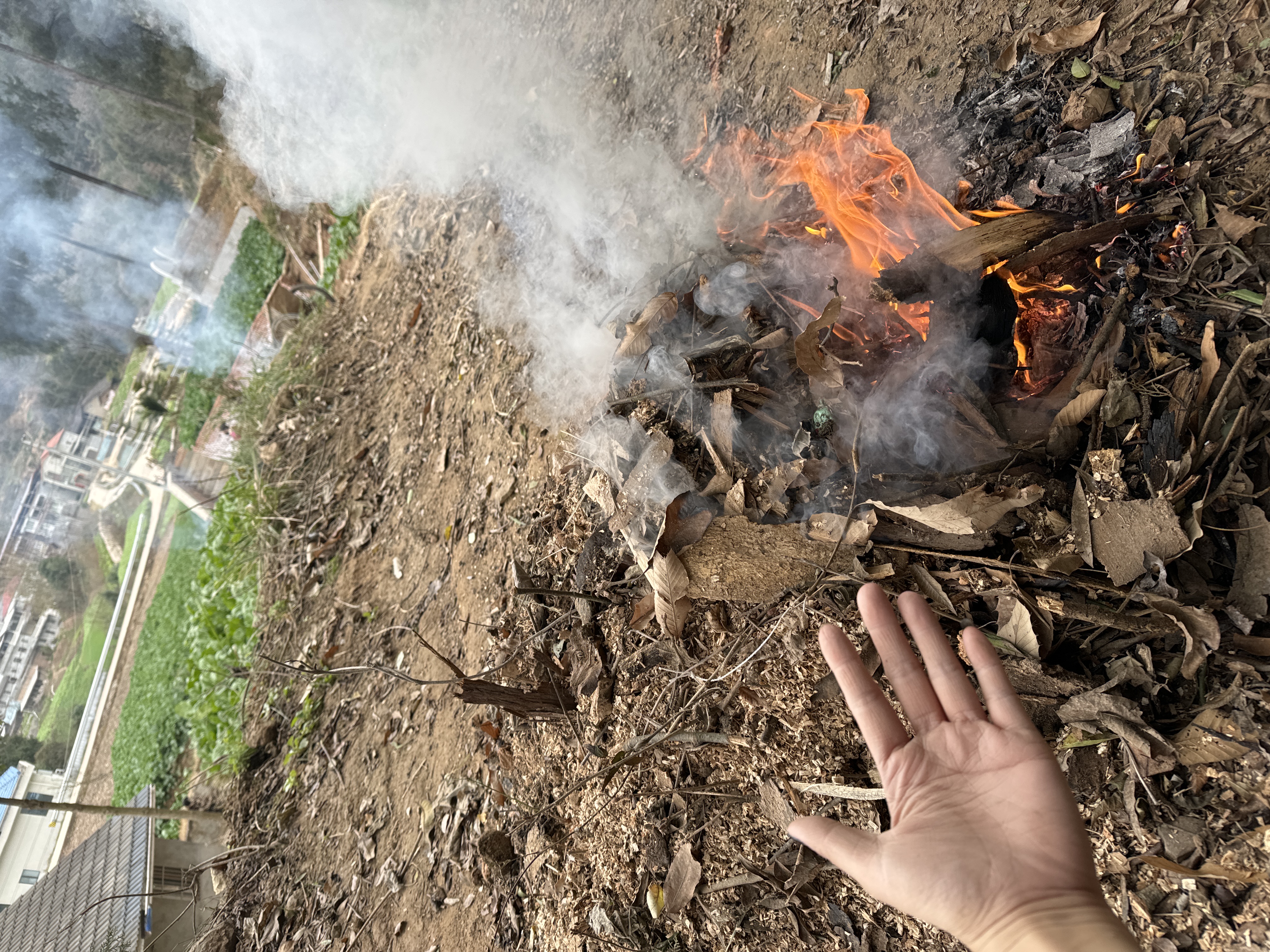 @辰辰 屋后面的叶子,烧干净了才拉土,要把土拉到别的地方去
